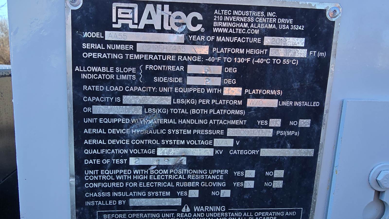 Altec Articulating Aerial Insulated Bucket Boom Lift (Model - AA55) (Serial # 0219FH7435) is in perfect working condition. Last inspection of Altec unit was on 05/2025.